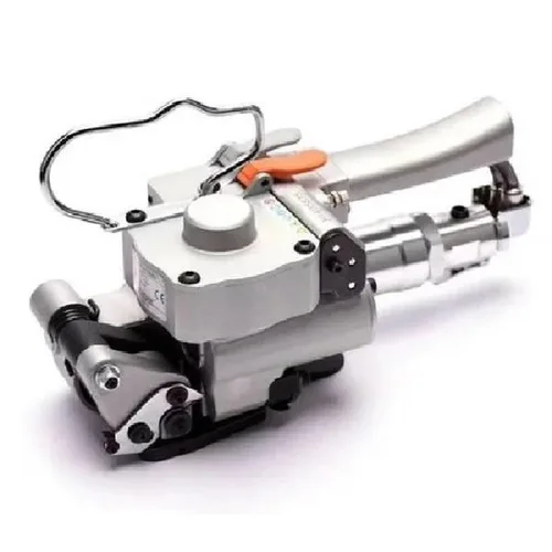 Automatic pneumatic strapping tool. Operates at 5-7 BAR pressure, suitable for PET/PP straps (12-25mm). Features friction sealing and adjustable tension.