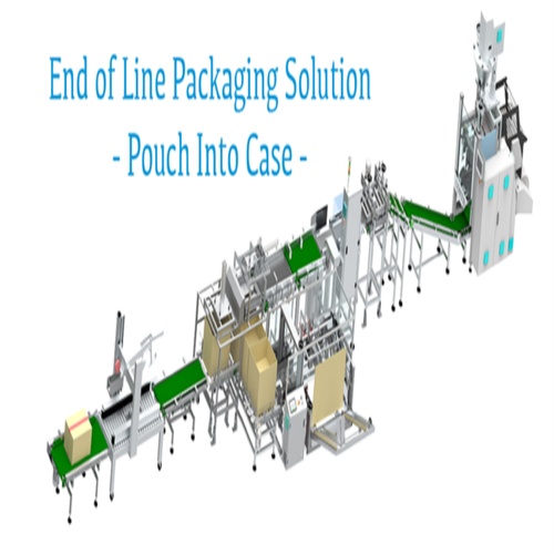 Automatic case packer for pouch to case conversion. Features 10 cases/minute capacity, SS or MS body (project specific), 50 Hz frequency, and 0.5 Mpa air supply.
