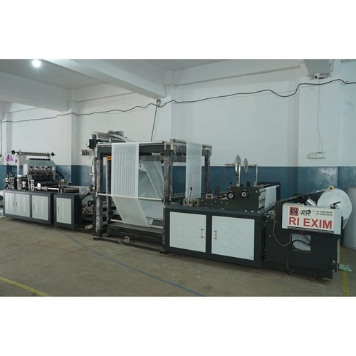Fully automatic carry bag making machine. Capacity of 60 pieces/min. Bag dimensions up to 300mm length, 800mm width, 80 GSM thickness. 380V, 8 kW.