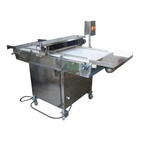 Semi-automatic stainless steel sweet cutting machine. Electric-powered, 100 kg batch capacity, 220V. Suitable for Kaju, Khoya Burfi. Standard and customized designs.