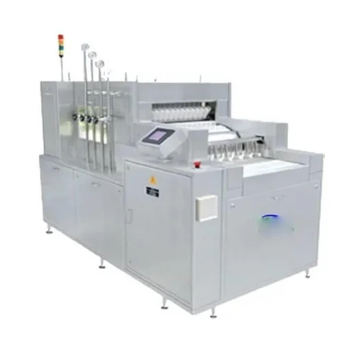 Automatic vial washing machine with a capacity of 100-220 vials per minute. Features three-phase power and a 1-year warranty. Designed for high-volume pharmaceutical production.