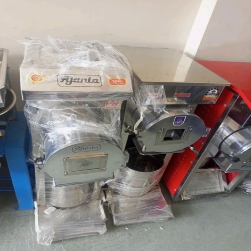 3 HP automatic commercial flour mill with 500 Kg/hr capacity. Stainless steel construction, 230V, three-phase electricity connection for industrial use.