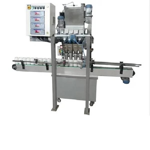 This four-head automatic auger filler machine is made of stainless steel for powder applications. It operates at 60-80 BPM, ensuring high-speed, precise filling.