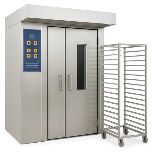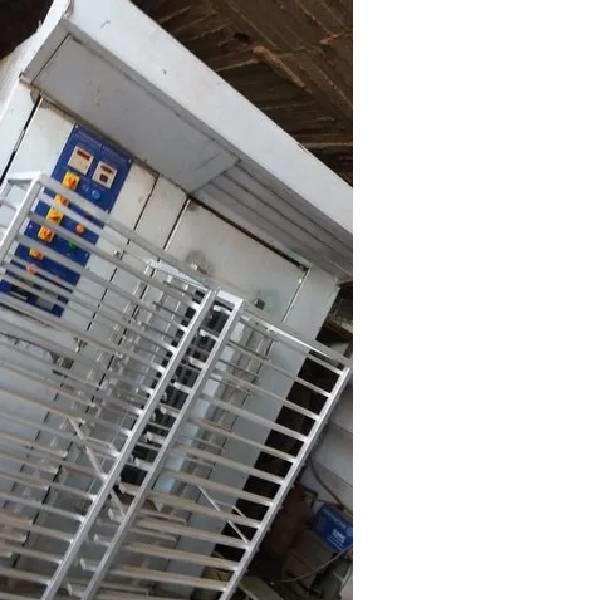 Automatic industrial oven for bakery applications. Mild steel construction, single door, electric/diesel powered. Operates for 12 hours with substantial capacity.