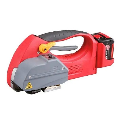 Automatic plastic strapping tool (H45 L) with friction sealing for PP/PET straps. 220V, 350Kgs tension, 0.5-1.27mm thickness. Battery offers 200 cycles/charge.