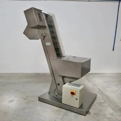 Automatic mild steel belt cap elevator machine. Capable of horizontal and inclined movement. Customized capacity and speed. Made in India.