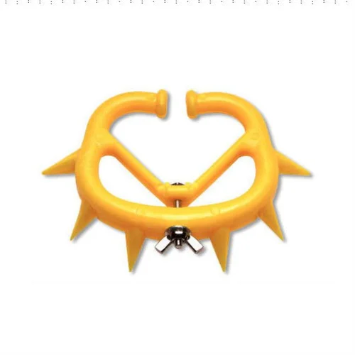 Yellow automatic plastic cattle weaner for calves. Prevents milk sucking. Features a nose thorn clip for effective feeding. Made from durable plastic. Designed for calf application.