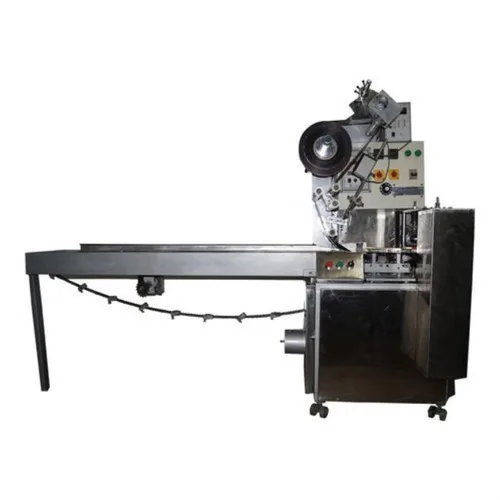 This automatic chikki packing machine operates at 220V, features a stainless steel construction, and uses center seal packaging. With a production capacity of 60 units per minute, it's designed for high-efficiency operation.