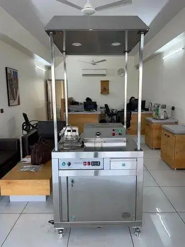 Automatic commercial sugarcane juice machine with chiller. Stainless steel construction, yielding 150-350 ml/kg. One year warranty included for commercial applications.
