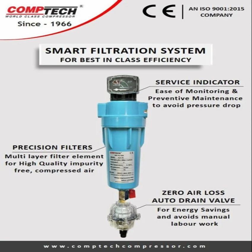 Automatic desiccant air dryer with 100 CFM flow rate and PLC control. Handles up to 50°C inlet temperature and 16cm² maximum pressure. Made in India.