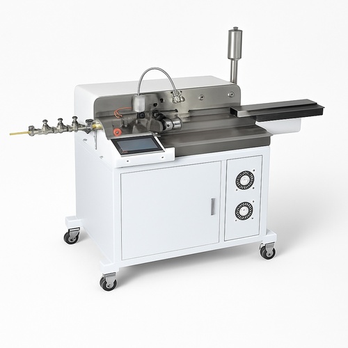 This automatic single-phase wire tinning machine features a standard design with a production capacity of 7000-13000 stickers per hour. It supports cutting lengths from 10mm to 600mm.