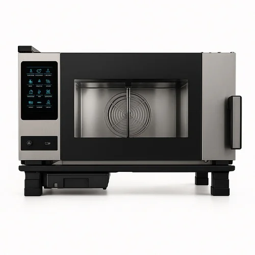 Automatic electric combi oven, large size, single door. Ideal for commercial use in bakeries, hotels, and restaurants for pizza, bread, and cookies.
