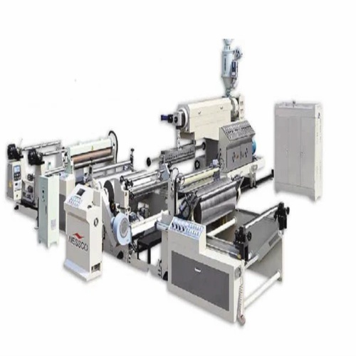 Automatic extrusion lamination machine with single/twin screw extruder options. PID controlled heaters, 100-200 m/min speed, and adjustable width from 500-1500 mm.