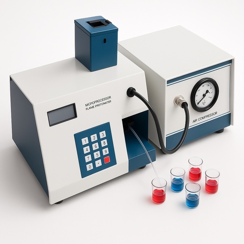 Automatic benchtop flame photometer featuring a 20x4 alphanumeric backlit LCD. Utilizes a silicon photodiode detector. Powered by 230V AC, 50 Hz. Customizable for laboratory use.