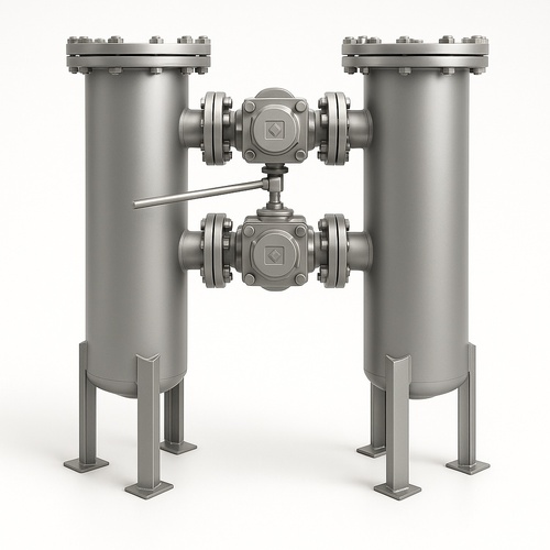 Automatic Duplex Strainer Machine made of Mild Steel. Features a flow capacity of 4000 L/min, 1.6 Mpa working pressure, and operates up to 400°C.