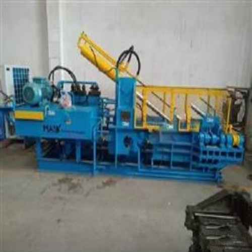 Automatic hydraulic baling press for industrial scrap. Mild steel, 150-ton capacity. Features 30 HP motor and specific chamber size.
