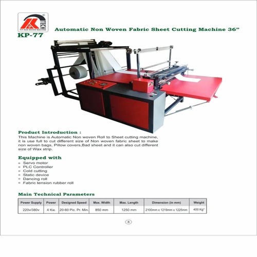 Industrial automatic non woven roll to sheet cutting machine. Capacity 60-80 pcs/minute. Max cutting width 1000 mm. Model KP-77-SCM, Made in India.