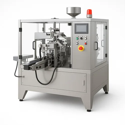 Automatic electric bottle filling machine with 4 feeding heads. Fills 50ml to 5L of oils/liquids at 40 bpm, 2000 pouches/hour.