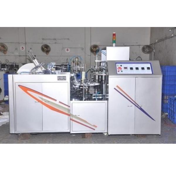 Automatic and semi-automatic PE paper tea cup making machine. Single phase electric power source. Capacity: >500 pieces/hour. Cup size: 0-100 ml. Mild steel construction. Weight: 1200 kg.