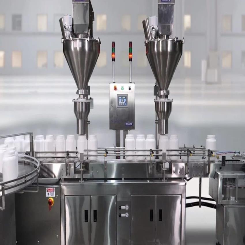 Automatic three-phase powder filling machine, 440 V, 90 BPM capacity. Constructed from stainless steel for pharmaceutical applications. Electric driven with 50 Hz power.