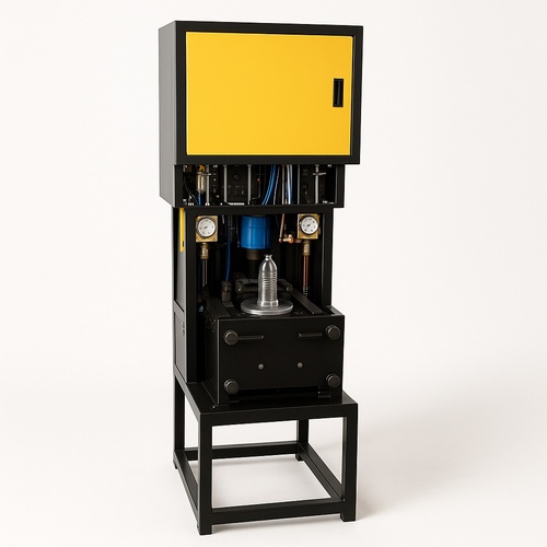 Semi-automatic plastic bottle making machine, 2 cavity mould, 1L bottle size. 440V, 50Hz, 20 HP power consumption. 1200 bottles/hour capacity.
