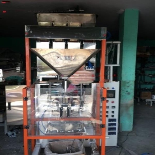 Automatic pulse filling machine with center seal packaging. Processes pulses and granules. Made in India, with a capacity of 1500-1800 pouches per hour.