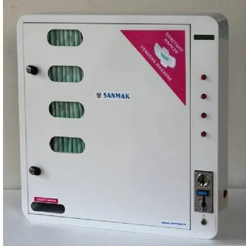 Automatic, wall-mounted coin-operated sanitary napkin vending machine for schools and colleges. Accepts 5 Rs. cash payment, holds 50 folded napkins, powered by 1 Hp.