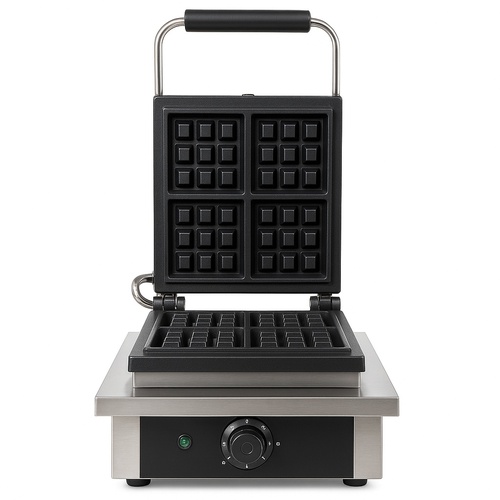 Automatic electric square waffle maker in black. Constructed from iron material, with a power consumption of 200 Watts. Ideal for creating square-shaped waffles efficiently.