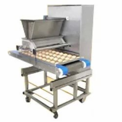 Commercial electric cookie dropping machine. Stainless steel construction, 500 kg/hr capacity. Features 4 HP motor, three-phase, automatic operation, and a 3-year warranty.