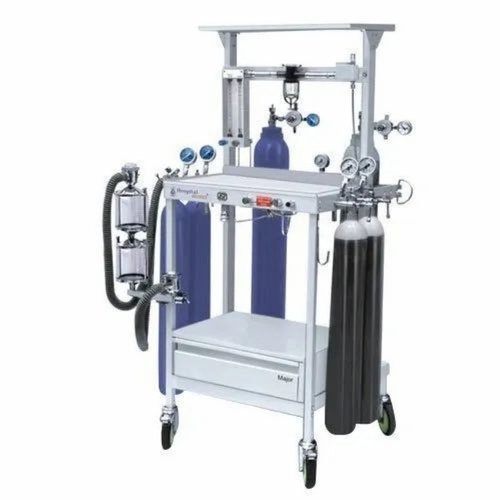 Automatic stainless steel medical anesthesia machine for operation use. Floor-mounted on a compact trolley. Model MAJOR SS, 240V, non-portable.