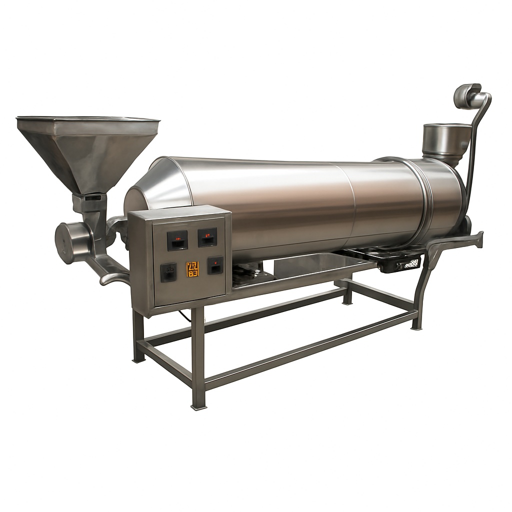 Automatic stainless steel roaster machine. Commercial application. Capacity: 50 Kg Per Hour. Size: 10x4 Ft. Operates on 220V.