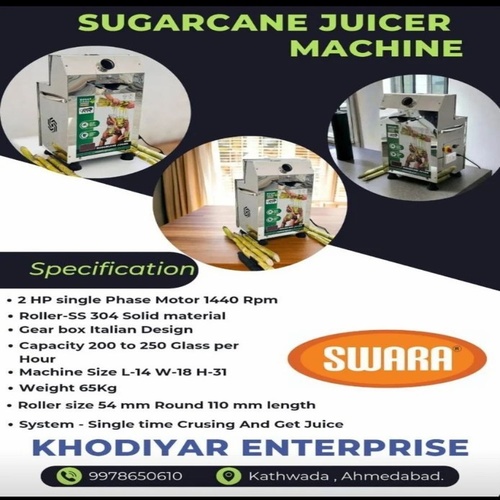 Automatic sugarcane juice machine with 2 HP motor. Made of SS 202 material with SS 304 solid rollers. Produces 300 ml/kg yield, 300 glasses/hr.
