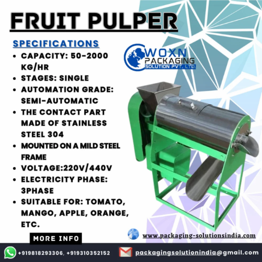 Single-stage automatic tomato pulp making machine. Features 1hp electric motor, SS/MS construction. Processes 100-200 kgs/hour, suitable for tomatoes and tamarind. Ideal for efficient pulp extraction.