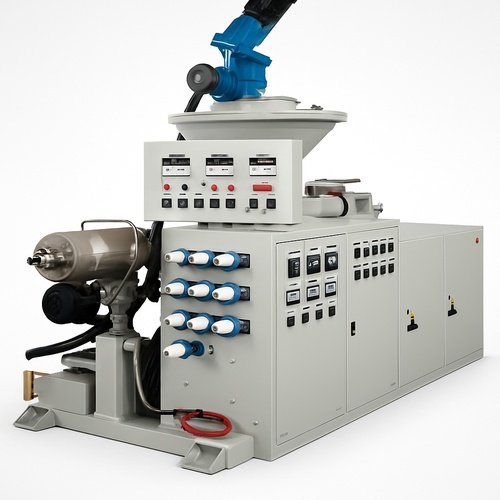 Automatic twin screw extrusion plant (52/18) with 15 HP main motor, 18-1 L/D ratio, and 60-90 Kg/H output for 20-110 mm pipes.
