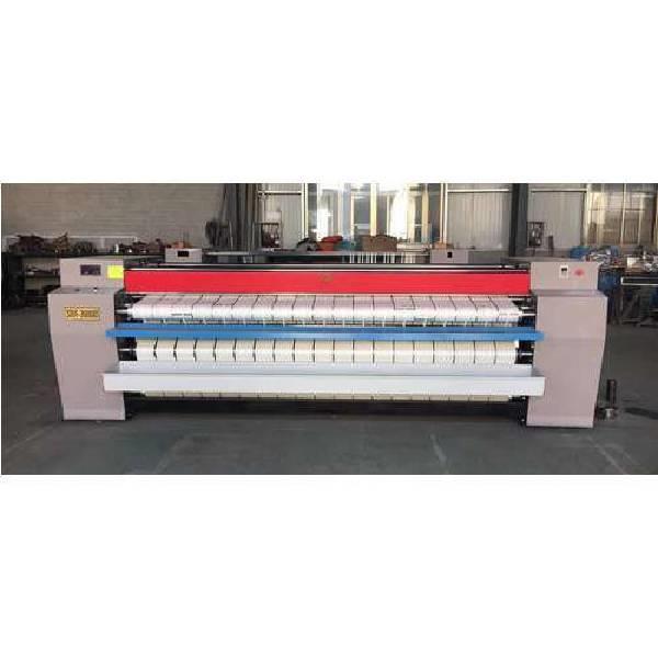 Automatic two-roll industrial calendering machine. Single-phase, 240V, electric powered with 1.2 kW/hr consumption. Produces 25,000 meters per 12 hours. Mild steel construction.
