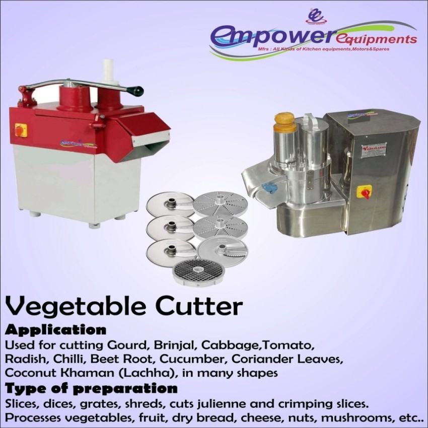 Automatic stainless steel vegetable cutting equipment. Capacity 200-400 kg/hr, performs slicing, dicing, mincing. Max slice thickness 4mm, max length 30mm. Operates on 220V.