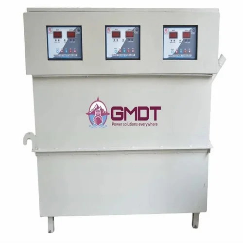 Automatic voltage stabilizer with 360-480V input and 400-415V output. 98% efficiency at full load. Frequency range 45-55 Hz. Made in India.