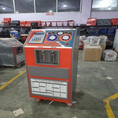 Automatic car AC gas charging machine for workshops. Features 100 LPM capacity, 18 g/s charge speed, 60 ltr/min vacuum speed, and 2 Stage vacuum pump. For CFCs refrigerant.