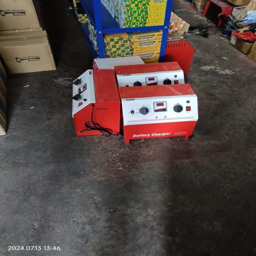 Single-phase, 50 Hz car battery charger unit with a 14.8V output. Features red, white, or blue color options. Connects positive cable to the battery's positive terminal for usage.