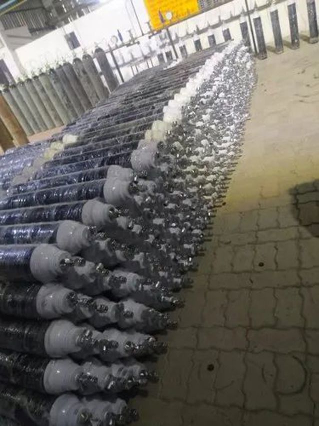 B-Type 10-litre medical oxygen cylinder made of mild steel. Rated for 150 kgf/cm2 working pressure, with 1.5 cubic meter gas capacity. ISO certified.