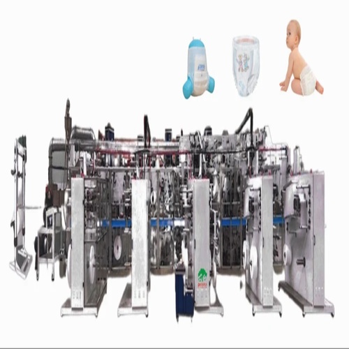 Automatic baby diaper making machine (220V/380V, 50Hz, 220kw). Mild steel construction, 40-50T weight, 2000x230x260cm dimensions.