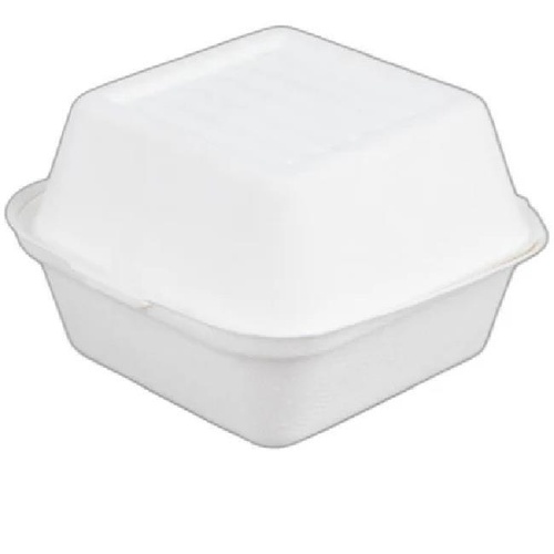 Eco-friendly sugarcane bagasse clamshell container for packaging. Durable and compostable material. Ideal for food service and takeout applications. Natural white color.