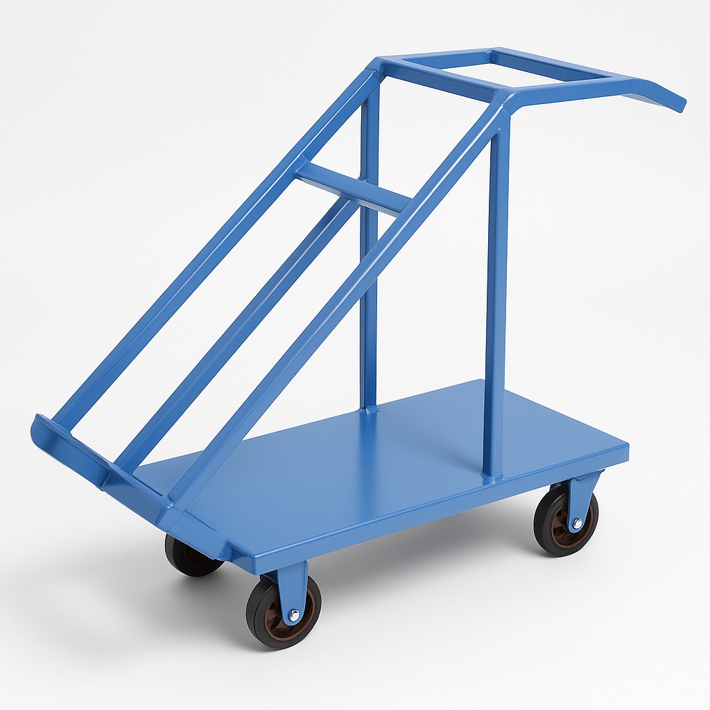 Industrial mild steel trolley in blue. Features 4 wheels and a load capacity for one oxygen and one LPG cylinder. Portable design with standard dimensions. Model sb-61.