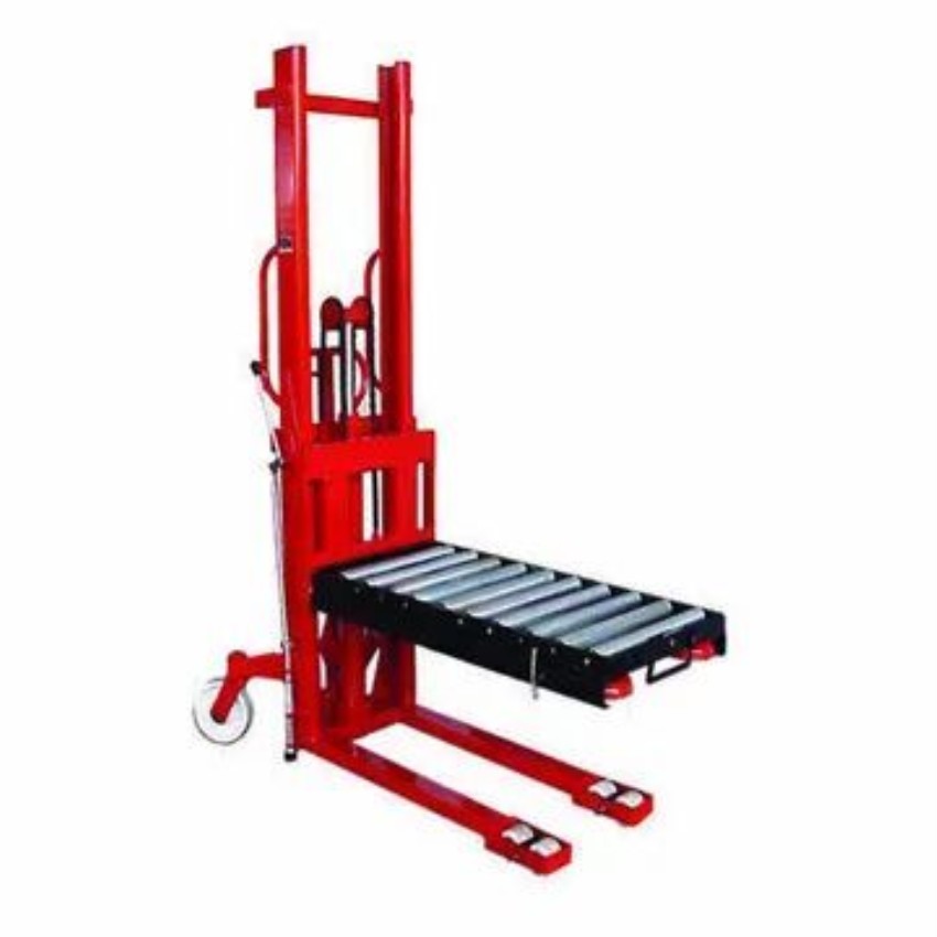 Portable roller-based stacker designed for efficient material movement. Features a robust roller system for easy mobility and stacking operations in industrial settings.