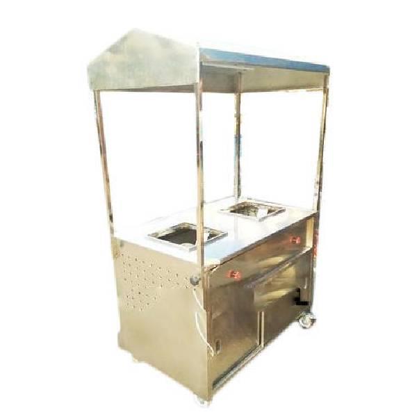 Rectangular stainless steel barbecue food stall. Features four wheels for easy mobility. Durable construction for food stall operations.