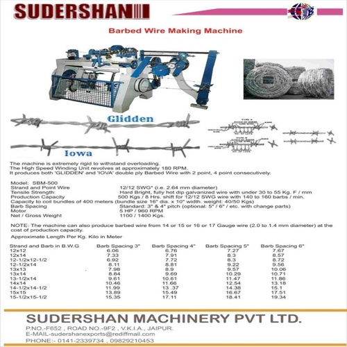 The SBM-500 barbed wire machine offers standard 3" x 4" barb spacing, producing 500kg/8hr for 12/12 SWG wire at 140-160 barbs/min. Features a 5 hp motor.