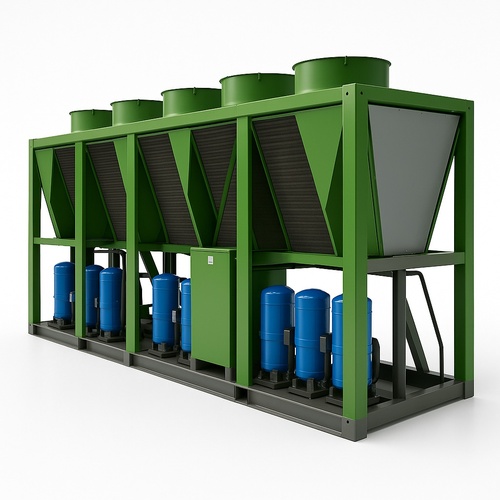 100 TR Air Cooled Batching Plant Chiller made of Stainless Steel. Operates on 440V, 50 Hz, 3 Phase power. Manufactured in India.