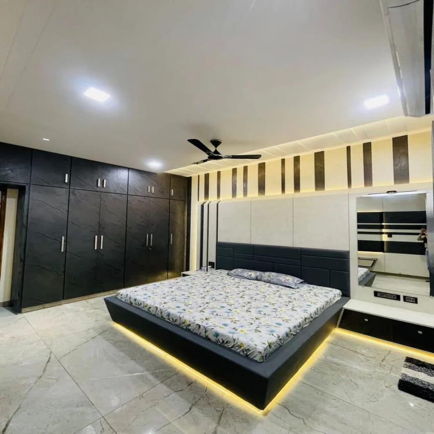 Modern bedroom interior design service for projects starting at 50 sq ft. Available PAN India with offline service mode and flexible payment options. Tailored to client requirements.