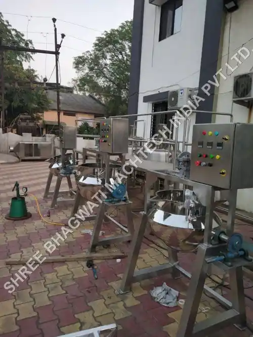 Bhagwati tilting paste kettle, SBPK model, with 10-250L capacity. Constructed from SS material, GMP grade, in silver color. Suitable for various industrial needs.