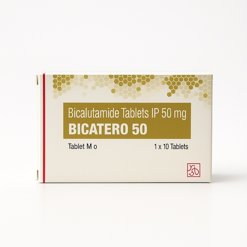 Bicalutamide 50 mg tablets for prostate cancer treatment. Each box contains 1x10 tablets. Manufactured by Hetero Healthcare Ltd.